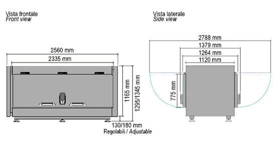 La cella poggia su una struttura in tubolare di acciaio inox AISI 304, completa di nr. 6 piedini antivibranti, diametro 140 mm, regolabili in altezza (60/80 H mm) per permettere il passaggio delle tubazioni di scarico.