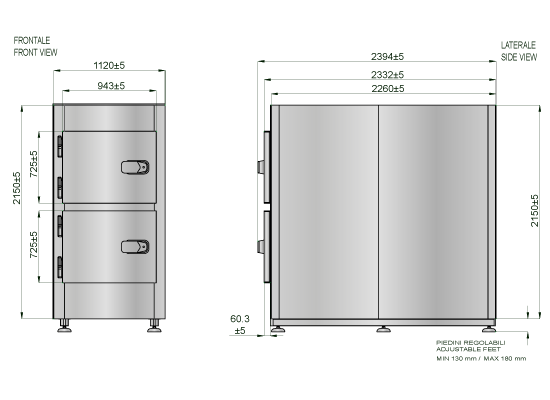 La cella poggia su una struttura in tubolare di acciaio Inox AISI304, completa di nr. 6 piedini antivibranti, diametro 140 mm, regolabili in altezza (130/180 H mm) per permettere il passaggio delle tubazioni di scarico.